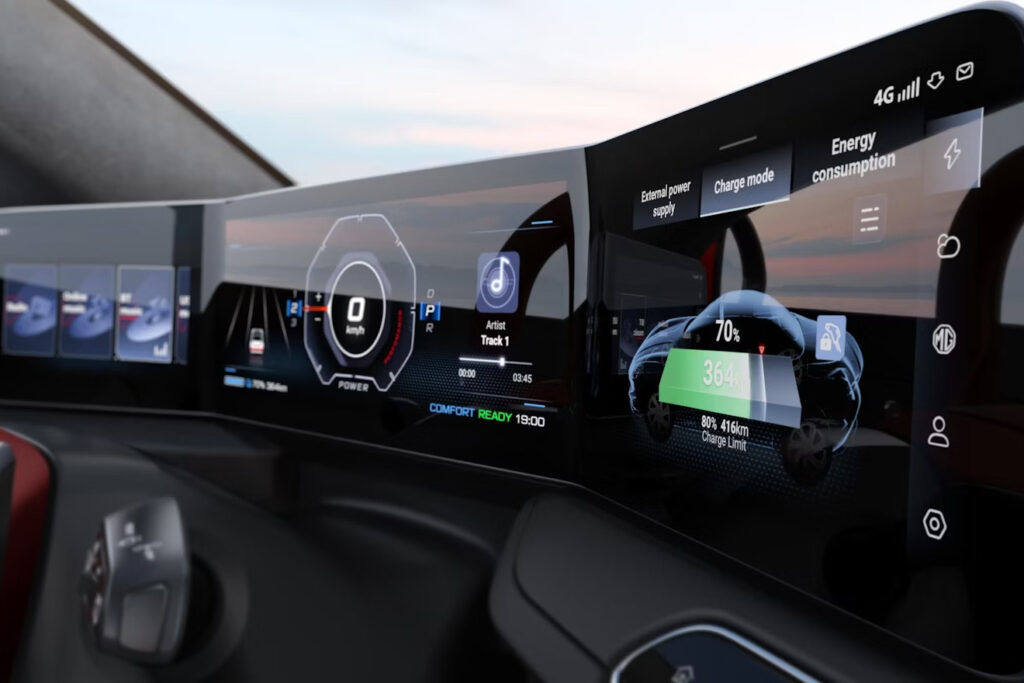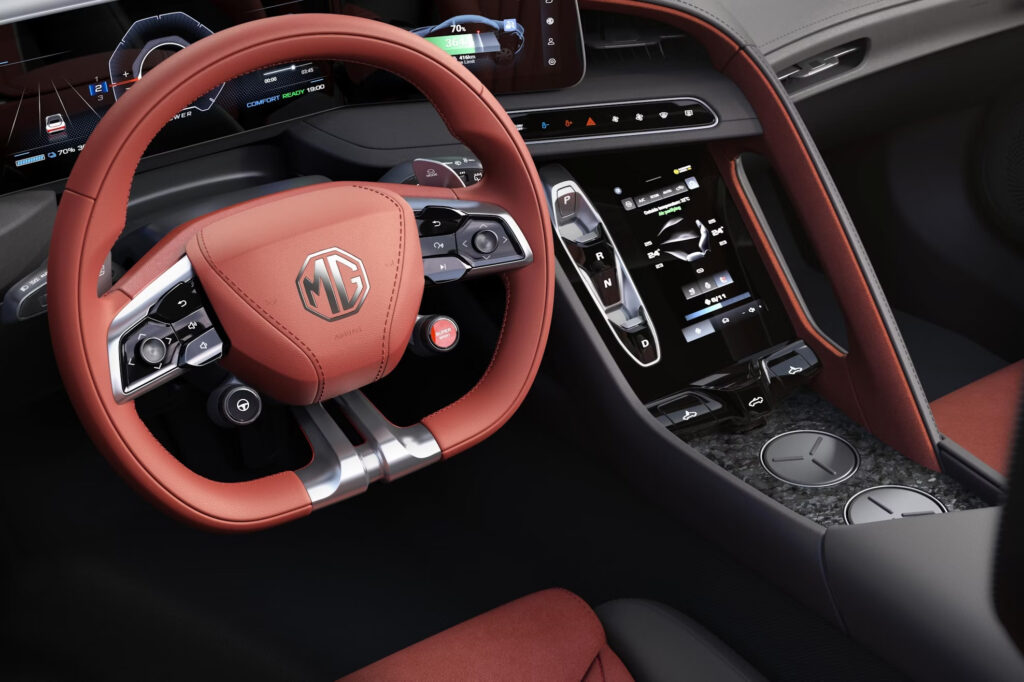 Das Design des MG Cyberster fällt durch eine prägnante Silhouette und auffällige Details auf. Flache Höhe, breite Spur und muskulöse Radkästen vermitteln Dynamik bereits im Stand. Die Proportionen – lange Motorhaube, kurze Überhänge – orientieren sich an klassischen Roadstern und greifen traditionelle Elemente auf, ohne altmodisch zu wirken. LED-Scheinwerfer, dynamische Lichtsignaturen und ein markantes Heck mit charakteristischer Linienführung runden das Bild ab. Typisch für den Cyberster sind elektrische Scherentüren („scissor doors“) sowie ein Soft-Top, das sich je nach Version automatisch öffnen lässt und für offenen Fahrspaß sorgt.